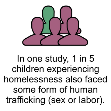 A 2016 study by Loyola University and Covenant House found that nearly 1 in 5 youth who received shelter services from Covenant House had experienced some form of human trafficking (Coerced or forced into labor or commercial sex)” (Murphy, “Labor and sex trafficking among homeless youth.” 2016)